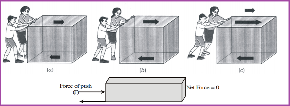 1. If we push a wall, the wall does not move at all i.e., it remains at rest. In this case, the force of push on the wall acts in the forward direction. On the other hand, the wall also exerts equal force on our hand in the backward direction. These two equal and opposite forces cancel out the effect of each other and hence these two forces are the balanced forces.