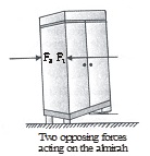 Ex. Let us consider a rigid almirah kept at rest on a horizontal surface. Let two forces F1 and F2 act simultaneously on the almirah from opposite directions. If the two forces are equal, the effects produced by one force get cancelled by the effect produced by the other. The net force or the resultant force is then zero. The almirah continues to remain at rest. When a numbers of forces acting on a body do not cause any change in its state of rest, or of uniform motion is a straight line then the force can said to be balanced forces.
