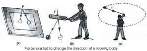 (c) When a stone is rotated in a circular path, the direction of motion of the stone change continuously. The force acting on the stone towards the center of the circular path is responsible for changing the direction of the stone.