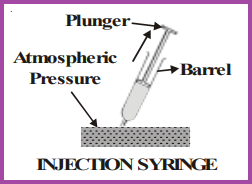 In Syringe the pressure of the liquid (blood) force the liquid to move into the syringe when its plunger is withdrawn.